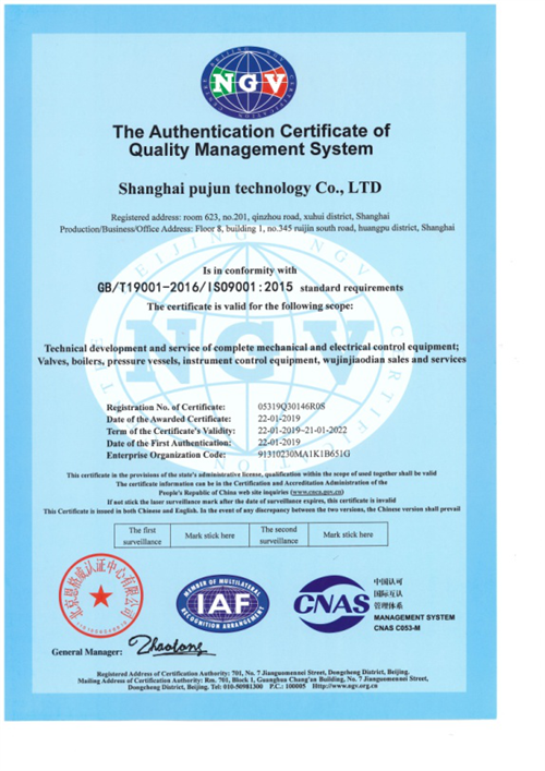 上海璞珺科技股份有限公司于2019年1月22日,通过iso9001质量管理体系认证。
